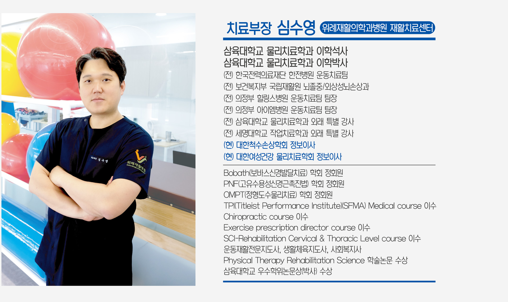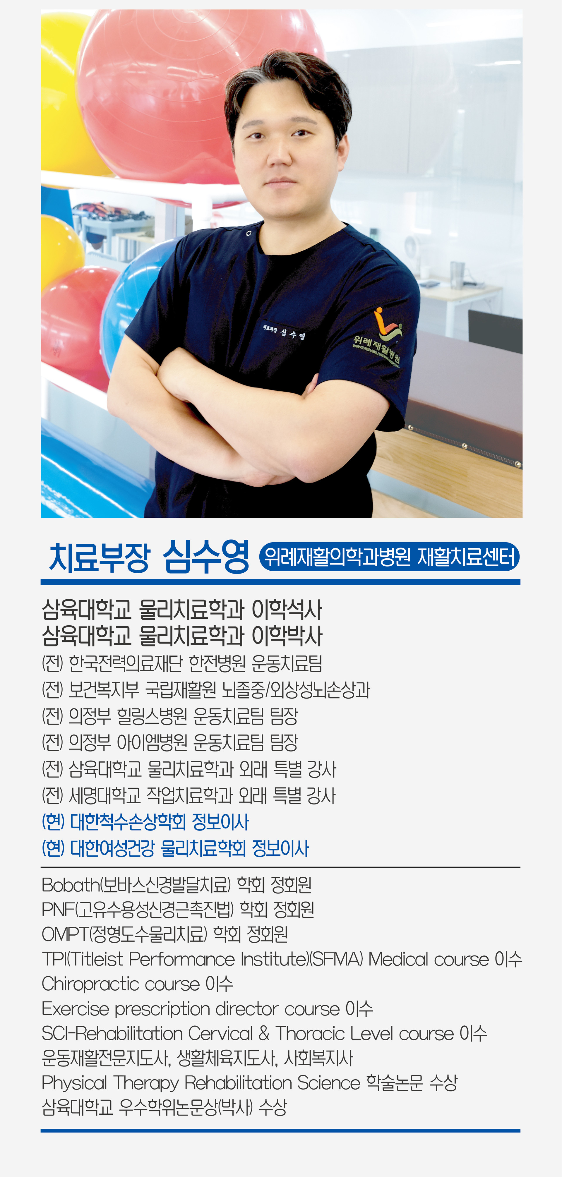변형된 척추나 관절 등에 마사지와 교정, 운동으로 원래의 상태로 회복이나 기능을 개선시켜 주는 치료입니다. 또한 인공관절 수술 후, 디스크, 오십견, 근골격계 환자에게 비술적 방법으로 통증을 완화시켜 신체불균형 개선, 만성통증 등을 치료합니다. 꾸준한 자세관리와 유연성 운동, 근력 강화 및 균형운동 등을 병행하여 치료효과를 극대화 할 수 있습니다.